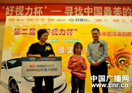 頒獎儀式上,一段來自河北偏道子小學的VCR,讓現(xiàn)場的每一個人為之動容。而最純凈眼睛的獲得者梁靜雨小朋友就是這樣一名貧困的學生。為了讓這雙純凈的眼睛更加充滿希望,北京好視力公司特別向河北偏道子小學捐助了價值2萬元的眼貼,并向其本人捐助助學金。那一刻,整個現(xiàn)場全都是暖暖的感動!