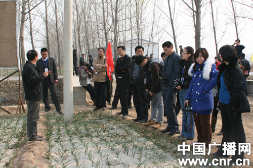 負(fù)責(zé)人在給記者同行們講解“無公害”大蒜與“有機(jī)”大蒜的區(qū)別(記者陳佳 攝)