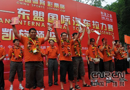 中廣網(wǎng)南寧10月12日消息(實習(xí)記者 申麗華)10月11日,2009中國--東盟國際汽車?yán)愒趹{祥友誼關(guān)圓滿落幕并舉行隆重凱旋頒獎儀式.來自廣東、貴港、河池的車手以總積分排名前三分獲冠亞季軍。