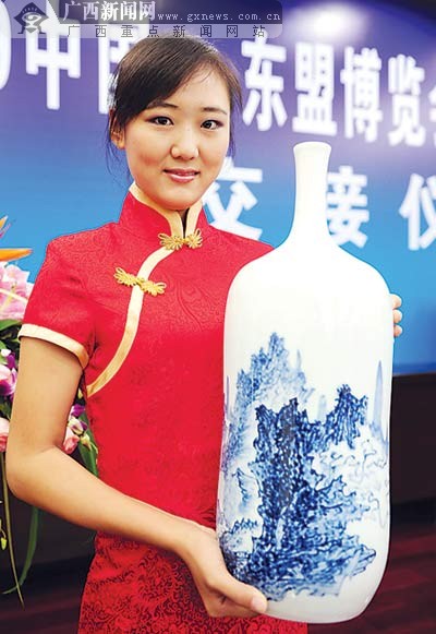 10月13日,第六屆中國(guó)-東盟博覽會(huì)國(guó)家政要及貴賓禮品——湖南省醴陵市紅玉紅瓷工藝瓷廠燒制的釉下“五彩瓷瓶”交接儀式在南寧舉行;顒(dòng)現(xiàn)場(chǎng)展示了黃、白兩色花瓶,瓶身圖案由鄭軍里等4名廣西知名畫家精心創(chuàng)作,取材主要為廣西少數(shù)名族和中國(guó)民間故事。(來源:廣西新聞網(wǎng))