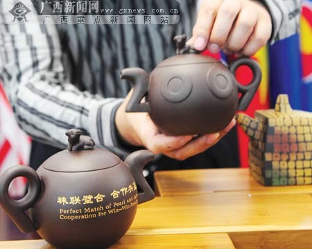10月14日,第六屆中國(guó)-東盟博覽會(huì)國(guó)家政要及貴賓禮品——12件“陶人葛”紫砂壺及22件“風(fēng)生水起”主題系列陶瓷亮相南寧。(來源:廣西新聞網(wǎng))