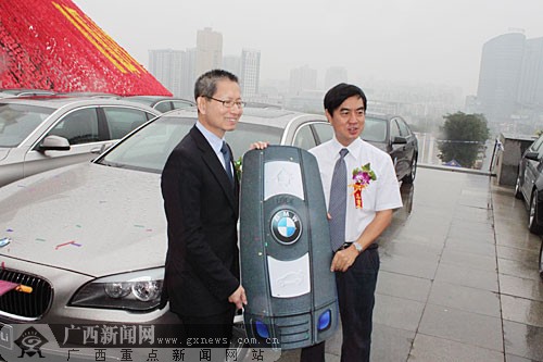 寶馬(中國(guó))銷售副總裁許智俊先生(左)向廣西國(guó)際博覽事務(wù)局局長(zhǎng)鄭軍健(右)遞交“車鑰匙”。(來(lái)源:廣西新聞網(wǎng))