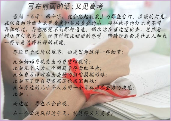 又是一個(gè)6月天,高考的號角再一次吹響?諝饫锊幻庥兄环N讓人窒息的壓抑。而在零零碎碎的片段中拾掇起有關(guān)高考的點(diǎn)點(diǎn)滴滴,當(dāng)初恐懼和不安的眼神,匆忙而模糊的身影,擁擠的課桌,堆疊如山的試卷和書本以及單調(diào)乏味的生活,卻都成了如今我們經(jīng)常咀嚼、不忍忘卻的回憶。我想說 |