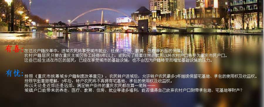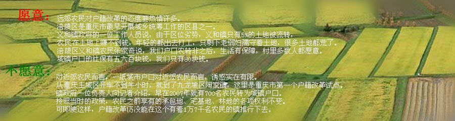 從本月15日開始,重慶市統(tǒng)籌城鄉(xiāng)戶籍制度改革在全市范圍內(nèi)正式施行。重慶此次大手筆推出的兩年300萬、十年1000萬的農(nóng)民進城計劃,將成為幾十年來我國戶籍制度改革規(guī)模最大、配套制度設(shè)計最完善、影響最深的一次實踐。