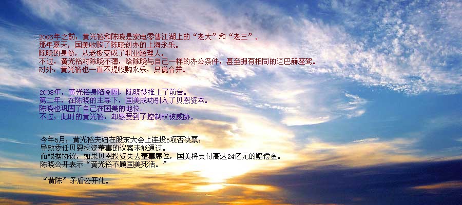18日,黃光裕方面突然發(fā)布了國美大股東致全體員工的一封信。在這封名為《為了我們國美更好的明天》的信中,黃氏以“疾風(fēng)知勁草,危難顯忠誠”等言語,大打悲情牌,并措辭激烈地對國美董事局主席陳曉進(jìn)行了批判,歷數(shù)了陳曉的三大罪狀。