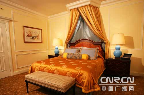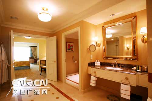 這是澳門威尼斯人度假村酒店3,000間豪華套房的其中一間。每個(gè)房間的面積最少為70 平方米,是歐陸式風(fēng)格和雅致主題的延續(xù)。每個(gè)房間均配有寬敞、裝飾典雅的客廳,以及大屏幕電視機(jī)及娛樂系統(tǒng),加裝天篷的兩張獨(dú)立睡床或一張?zhí)卮笏、大型沙發(fā)床,以及分別可供淋浴及浸浴的大理石豪華浴室。