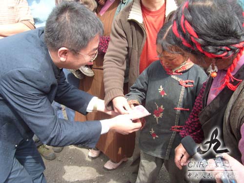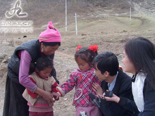 終于在當天下午到達位于四川甘孜藏族自治州益登措姆的家。熱情的益登措姆一家人向報道組成員獻上了潔白的哈達。深圳記者站副站長孫松濤還當場拿出錢捐給益登措姆的家人。在介紹了對益登措姆的救助計劃之后,益登措姆的家人對中央人民廣播電臺不遠千里來救助他們可愛的女兒表示了深切的感謝。