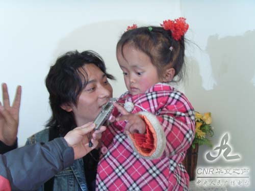 由于記者與孩子之間語言不通,藏族歌手阿浪多杰正在翻譯
