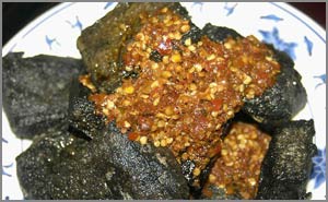 用黃豆為原料的水豆腐,經(jīng)過專用鹵水浸泡半月,再以茶油經(jīng)文火炸焦,佐以麻油,辣醬。它具有"黑如墨,香如醇,嫩如酥,軟如絨"的特點,奇在以臭命名,不同于其它食鹵以香自翊。聞起來臭,吃起來香,外焦微脆,內(nèi)軟味鮮。這是因為鹵水中放有鮮冬筍、瀏陽豆豉、香菇、上等白酒等多種上乘原料,故味道特別鮮香。 |