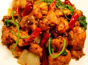 當(dāng)?shù)匦》N子雞煮至半熟,切成長條,油鍋煸炒而成。質(zhì)地細(xì)嫩,酸、辣、鮮、香。