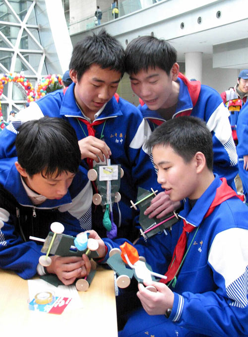 2003年11月27日,上海交通大學(xué)的一位志愿者(后右)在上?萍拣^輔導(dǎo)小朋友制作牛頓火箭車。
