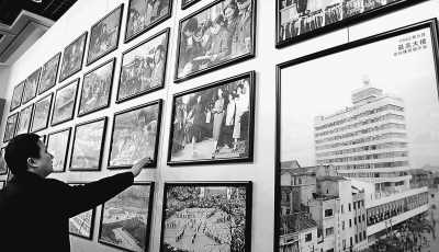 12月14日,一名展覽工作人員被布展完畢的老照片吸引。300多幅新舊圖片,展示重慶各行各業(yè)30年來的發(fā)展變化,《重慶市紀(jì)念改革開放30年展覽》目前已經(jīng)進(jìn)入最后準(zhǔn)備階段,將于18日正式開展。