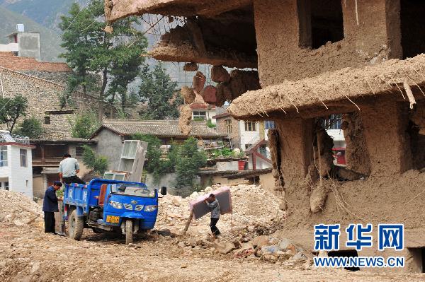 8月22日,三眼峪溝地區(qū)的一座危樓旁,居民從房內(nèi)清理出物件準(zhǔn)備運(yùn)走。