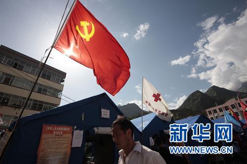 8月19日,在舟曲縣一個災民安置點,一面黨旗迎風飄揚。新華社記者 任正來 攝