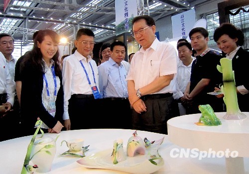 5月16日,中共中央政治局常委李長春來到第六屆中國(深圳)國際文化產(chǎn)業(yè)博覽交易會(huì)考察,望不斷總結(jié)經(jīng)驗(yàn),把中國(深圳)文博會(huì)辦成中國文化產(chǎn)業(yè)走向世界的國際知名品牌。圖為李長春在文博會(huì)參觀臺(tái)灣文化創(chuàng)意精品法藍(lán)瓷展。 中新社發(fā) 陳文 攝