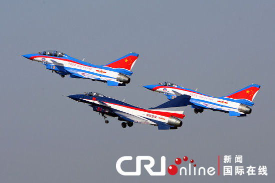 國際在線報道:近日,空軍八一飛行表演隊駕駛新涂裝的殲10表演機將飛抵珠海,在中國第八屆航展(珠海航展)期間進行各種高難度的編隊飛行表演。雖然航展尚未開幕,但涂裝一新的殲10表演機已成為此次航展最受矚目的焦點之一。