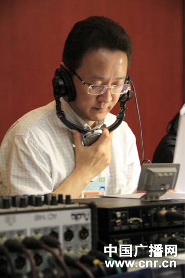 中央臺總編室新聞宣傳管理處處長劉磊在審聽直播前試音