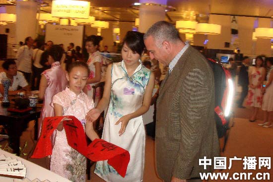 天津11歲小學(xué)生王灝融將現(xiàn)場(chǎng)書寫的書法作品送給外賓朋友(中廣網(wǎng)記者王嘉軍 攝)