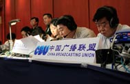 中央臺總編室新聞宣傳管理處處長劉磊在審聽直播前試音