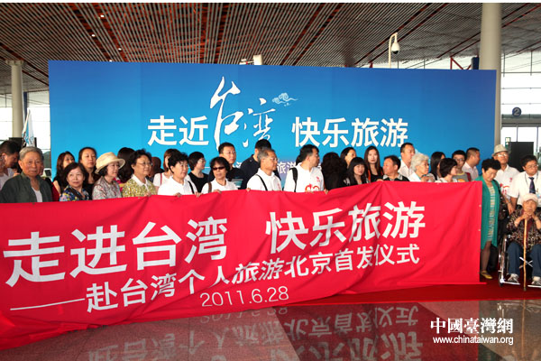 赴臺個人游啟動首日,第一批61名游客將于今日上午8:30乘坐國航ca185航班自北京起飛,預計中午(28日)之前抵達臺北桃園機場。國家旅游局、國臺辦、北京市旅游局、臺旅會等部門在首都機場為首日首批赴臺游客舉行了簡短的歡送儀式。