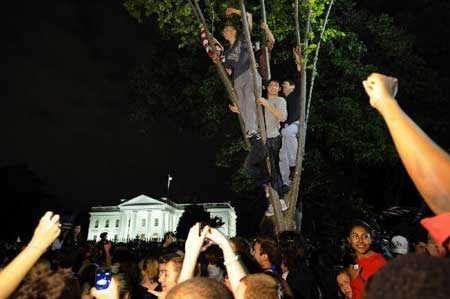 5月1日深夜,白宮門前歡慶的人們,不少人爬上樹枝