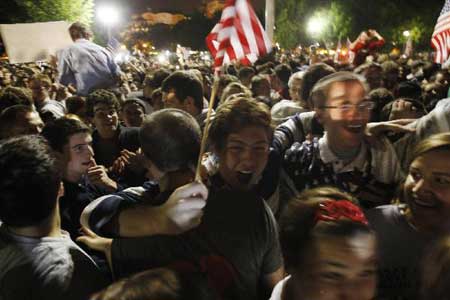 據美國媒體報道,美國總統奧巴馬宣布基地組織頭目本·拉丹被擊斃的消息后,美國許多民眾在5月2日凌晨自發(fā)舉行了慶祝活動。