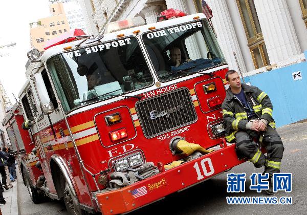 5月2日,一輛消防車在美國紐約世貿(mào)遺址附近待命。美國總統(tǒng)奧巴馬1日晚宣布“基地”組織領(lǐng)導(dǎo)人本·拉丹被擊斃后,紐約市2日在時(shí)報(bào)廣場(chǎng)、世貿(mào)遺址附近及大中央車站等重要公共場(chǎng)所加強(qiáng)警力,以防止出現(xiàn)新的恐怖襲擊。新華社記者伍婧丹攝