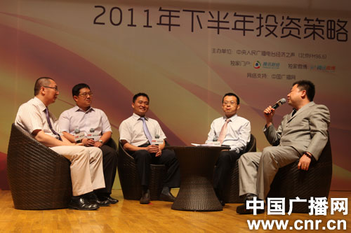 “央廣理財(cái)季”17日隆重起航,以2011年下半年投資策略為主題;顒(dòng)現(xiàn)場(chǎng)將以貼近民生的理財(cái)話(huà)題為主題,以聽(tīng)眾+專(zhuān)業(yè)理財(cái)嘉賓+經(jīng)濟(jì)之聲王牌主持的現(xiàn)場(chǎng)交流互動(dòng)為形式,為聽(tīng)眾與專(zhuān)家搭建零距離互動(dòng)交流平臺(tái)。圖為西南證券首席策略分析師張剛(左一)、騰訊名博李堅(jiān)(左二)、中國(guó)銀河證券首席策略分析師孫建波(中)、鵬華基金王宗合(右二)、經(jīng)濟(jì)之聲主持人侯杰(右一)現(xiàn)場(chǎng)討論2011下半年投資策略。( 中廣網(wǎng)記者任芳 攝)
