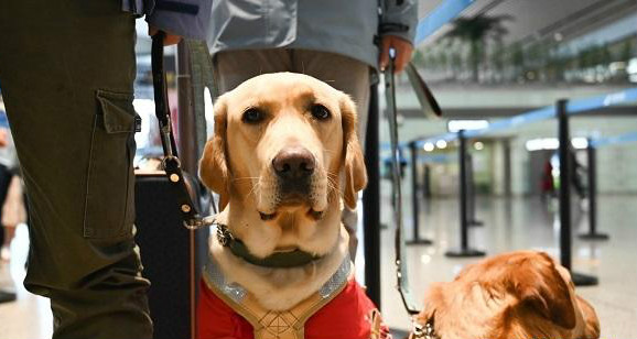 導盲犬“辛迪”“卡門”乘機記:身著紅色工作服 全程不吵不鬧