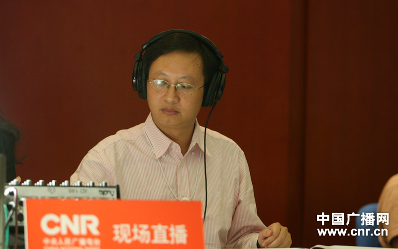 總編室副主任胡國華監(jiān)聽直播情況。(中廣網記者 陳曉冉 攝)