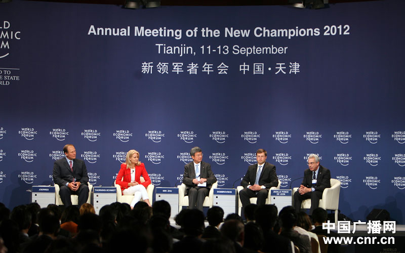 2012夏季達(dá)沃斯論壇在天津梅江會(huì)展中心舉行,上午十點(diǎn)半,在達(dá)沃斯廳召開(kāi)以歐洲危機(jī)及其全球影響為主題的公開(kāi)會(huì)議,國(guó)際貨幣基金組織副總裁朱民出席,會(huì)議探討了歐盟和新興市場(chǎng)之間的貿(mào)易與投資以及歐元在國(guó)際貨幣體系中的作用等內(nèi)容。(中廣網(wǎng)記者 陳曉冉 攝)