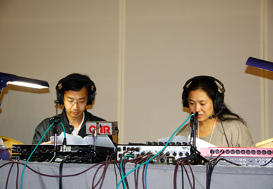 技術(shù)中心周俊生給經(jīng)濟之聲記者黃耀偉戴監(jiān)聽耳機