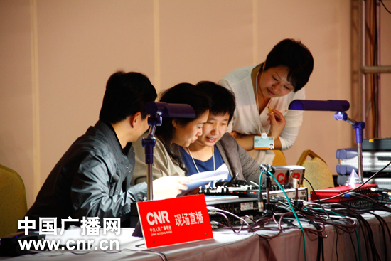 總編室趙威、聶巧與兩位主持人討論直播事宜(中廣網(wǎng)記者劉夢(mèng) 攝)