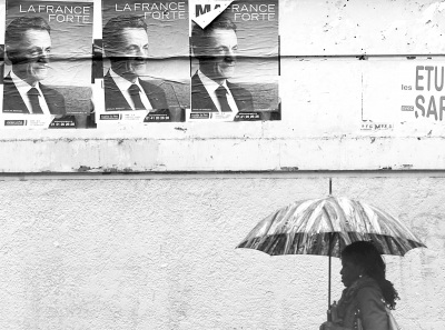 圖為4月10日,在法國巴黎街頭,一名女子走過現(xiàn)任總統(tǒng)、人民運動聯(lián)盟候選人薩科齊的競選海報。新華社發(fā)