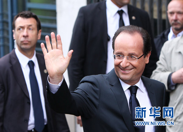 5月6日,法國社會(huì)黨候選人弗朗索瓦·奧朗德(前)抵達(dá)法國南部城市圖勒一家投票站。新華社記者高靜攝