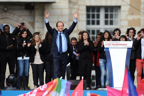 4月15日,法國(guó)社會(huì)黨總統(tǒng)候選人弗朗索瓦·奧朗德在巴黎舉行的大規(guī)模競(jìng)選集會(huì)上向支持者致意。
