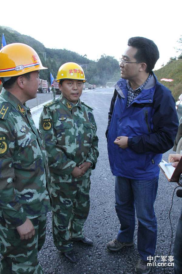 中央臺記者梁永春采訪武警交通部隊(duì)官兵(中廣網(wǎng)記者劉鵬攝)