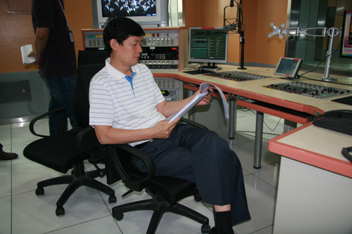 華夏之聲總監(jiān)韓長江仔細(xì)審閱直播稿件