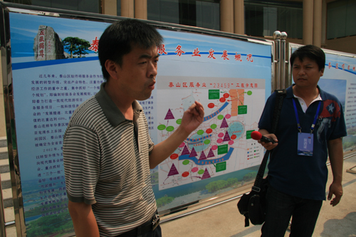 華夏之聲副總監(jiān)胡翼(右)采訪泰安城市規(guī)劃