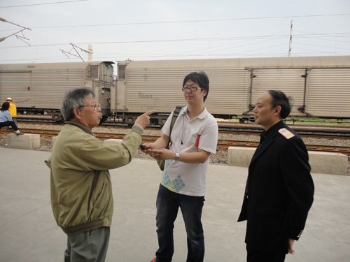 湖北武漢江岸車(chē)站原貨運(yùn)主任邢慶文(左一)向華夏之聲記者介紹當(dāng)年供港物資裝車(chē)情況