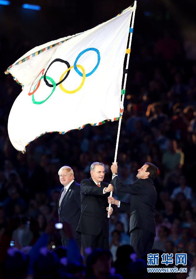 8月12日,第30屆夏季奧林匹克運(yùn)動(dòng)會閉幕式在倫敦奧林匹克體育場舉行。這是閉幕式上,國際奧委會主席羅格(中)將奧林匹克會旗交給下屆夏季奧林匹克運(yùn)動(dòng)會舉辦地巴西里約熱內(nèi)盧市市長愛德華多·帕伊(右)。新華社記者凡軍攝