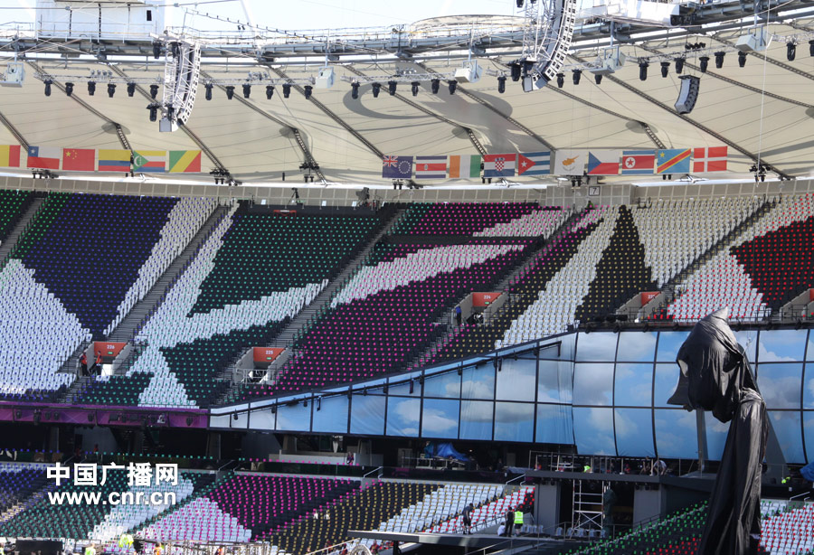 初始我以為為了讓觀眾靠的更加舒服,實際上,它是由9個可變化顏色的小燈泡組成。于是,當總導演需要時,整個倫敦碗的觀眾席都可呈現(xiàn)出一副波瀾壯闊、五顏六色的音樂的奏章。(中廣網(wǎng)特派記者束偉發(fā)自倫敦)