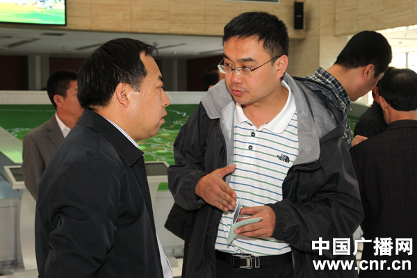 河北記者站站長王志勇在《傾聽河北》采訪中與副站長杜震商討報道方案