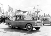 北京汽車制造廠生產(chǎn)的第一批北京牌和井岡山牌轎車,出現(xiàn)在1958年10月1日的國(guó)慶游行行列中