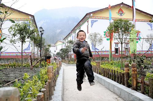 4月1日,在四川省汶川縣三江鎮(zhèn)的“藏家風(fēng)情園”里,一個小朋友在自家門前玩耍。新華社記者陳凱攝