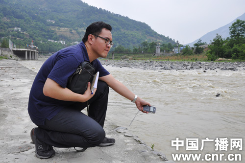 廣東臺記者張斌在收錄河道的音響。中廣網(wǎng)記者郭璇 攝