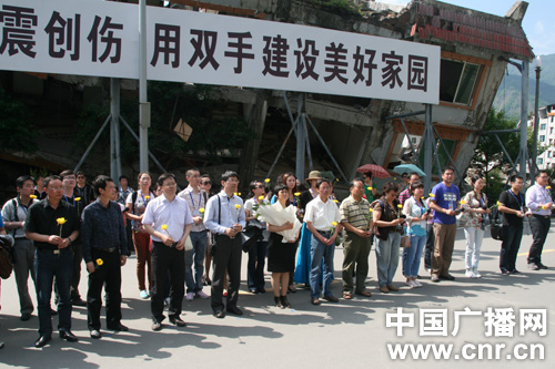 全國百家電臺(tái)走轉(zhuǎn)改報(bào)道團(tuán)在北川地震紀(jì)念碑前獻(xiàn)花