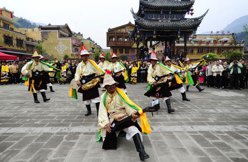 4月19日,四川省紅原縣的麥洼鍋莊表演隊(duì)伍的表演吸引眾多游客觀賞。
