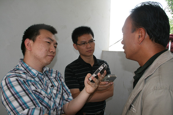 經(jīng)濟之聲記者唐明(左一)采訪磚壁村村長