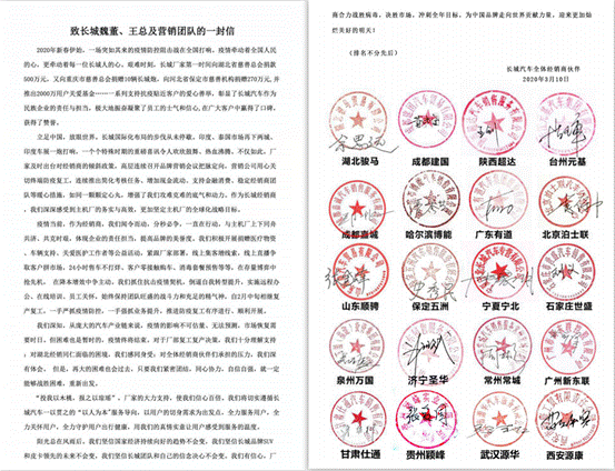 3月10日,長城汽車收到124家經(jīng)銷商伙伴聯(lián)名書寫的《致長城魏董、王總及營銷團隊的一封信》,信中經(jīng)銷商伙伴對長城汽車在疫情期間的大力支持表示感謝,這封至真至誠的感謝信,提振了長城汽車集體信心的同時,也給處在“寒冬”的車市帶來溫暖。